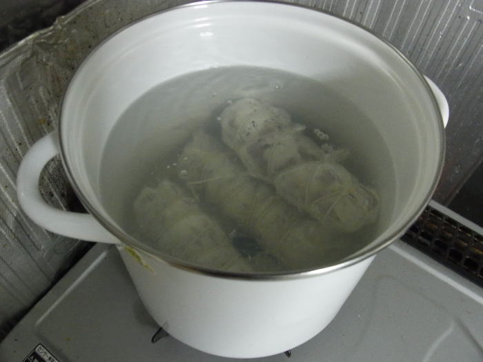 ⑥ 包んだら沸騰したお湯に入れて、入れたらすぐ火を消して8時間放置。(余熱でじわじわと肉に熱を通していく)
