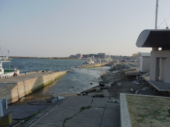 恐らくは液状化と地盤沈下によって岸壁が沈んだんだと思いますが、目にしてみるとその被害の大きさを改めて感じます。