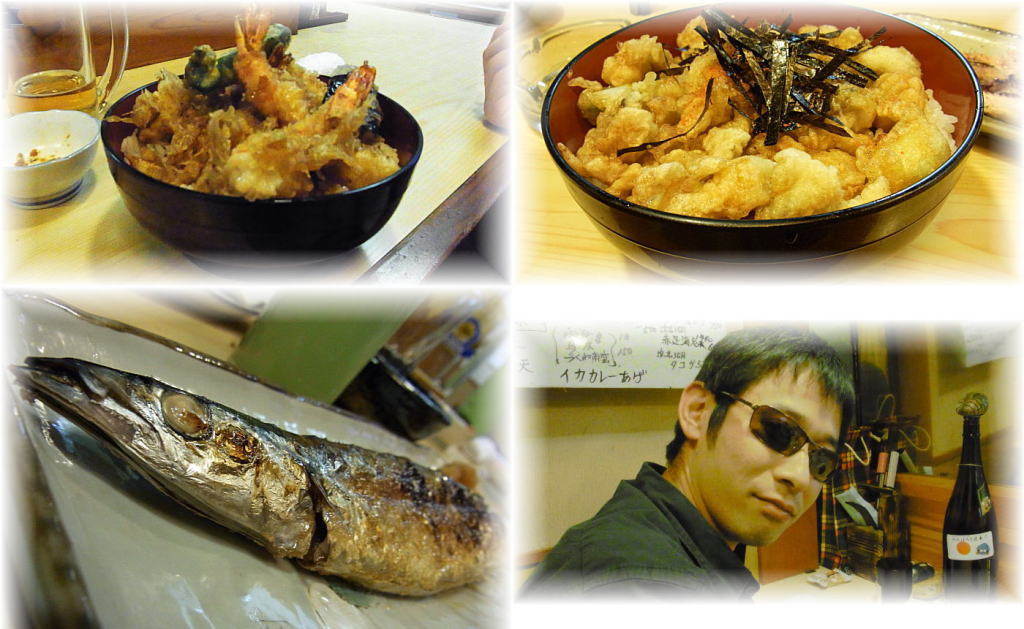 【刺身に天丼、なめろう焼き串、新サンマに珍しい生あさりの天丼(コレが旨い)、日本酒がすすむこと美味いこと(*´ω`*) たいら氏があっという間にヘベレケにw】