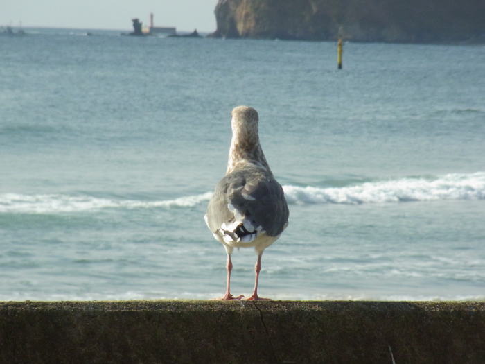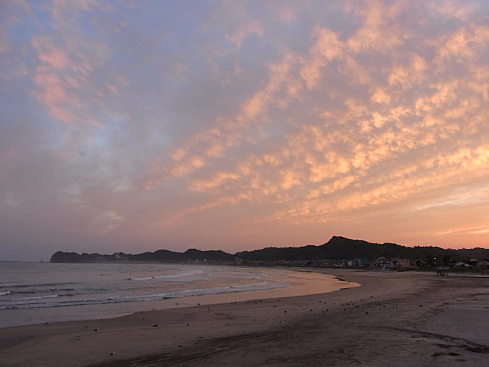 奥ではサーファーが、手前ではウミネコが水上をプカプカと・・・